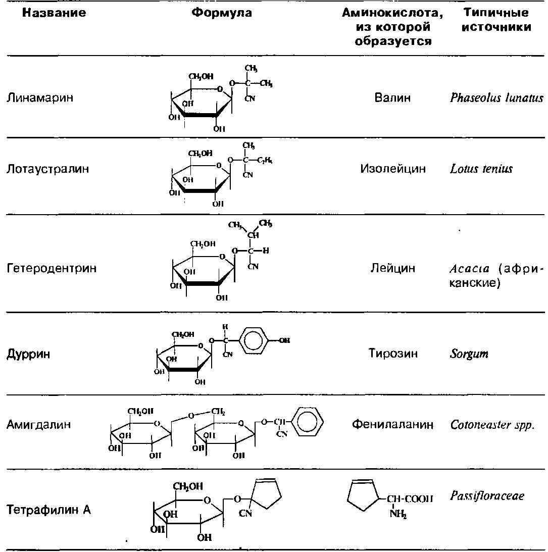 Циангидрины цианогенных гликозидов образуются из соответствующих аминокислот; в качестве сахарного остатка почти всегда фигурирует D-глюкоза, гликозидная связь которой имеет в-конфигурацию.