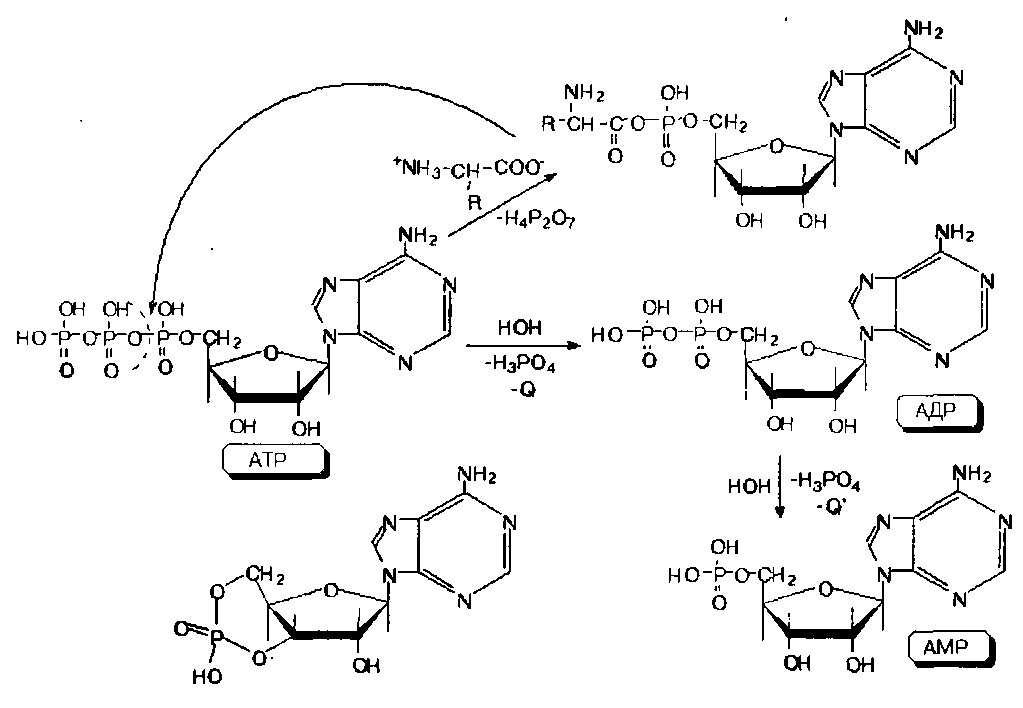 Образовавшийся аденозиндифосфат может гидролизоваться до аденозинмонофосфата с выделением еще некоторого количества энергии. Кроме того, фосфатные группы могут замещаться другими нуклеофилами - например, аминокислотами с образованием ацилфосфатов, которые являются ангидридами по своей химической природе и могут, в свою очередь, легко вступать в другие биохимические реакции также с выделением энергии. Широко распространен в живых системах циклический изомер AMP, выполняющий функцию посредника в работе ряда гормонов и нервных медиаторов.