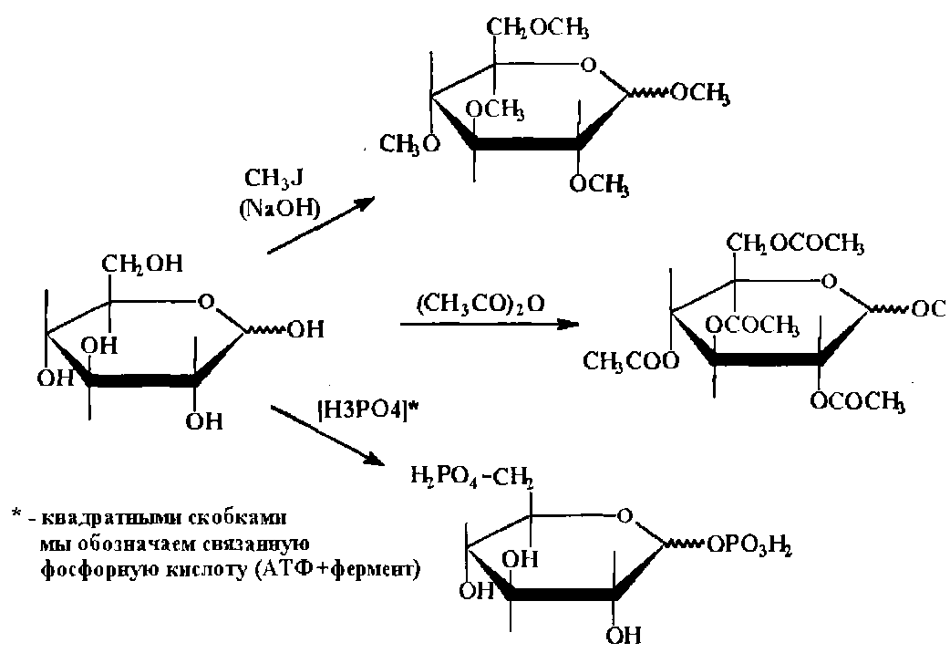 Из типичных спиртовых свойств моносахаридов следует отметить, в первую очередь, реакции этерификации различного типа, ведущие к образованию сложных эфиров карбоновых кислот, сложных эфиров минеральных кислот, простых алкиловых эфиров. Так как в молекуле любого моносахарида содержится несколько спиртовых групп, то очевидно, что в любом случае эти реакции могут иметь различную степень кратности, т.е. могут быть получены, в зависимости от активности реагента, моноэфиры, дизфиры, триэфиры и т.д. При этом не полностью этерифицированные моносахара будут представлены еще и набором региоизомеров. Таким образом, в одной только реакции ожидаемое многообразие получаемых эфиров более чем достаточно.