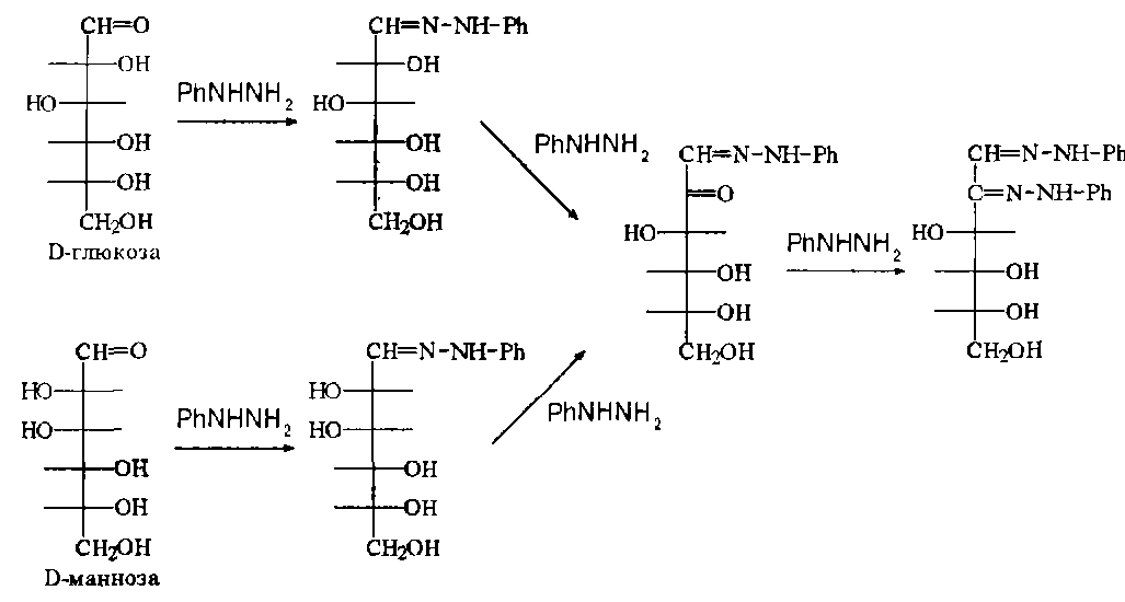 Характерным свойством моносахаров, обязанным совместному присутствию карбонильной и гидроксильной функций, является реакция образования озазонов, образующихся при взаимодействии как альдоз, так и кетоз с фенилгидразином. Обычная азометиновая конденсация по карбонильной группе моносахарида с одной молекулой фенилгидразина приводит к соответствующему фенилгидразону, но характерно то, что процесс на этом не заканчивается, а наблюдается последующая реакция окисления соседней гидроксильной группы до карбонильной, на что расходуется еще одна молекула фенилгидразина, далее новая карбонильная группа конденсируется с третьей молекулой фенилгидразина.