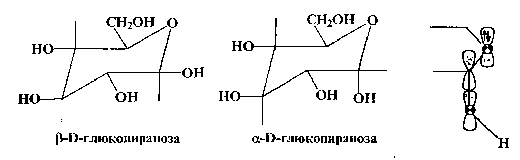 б-Форма глюкопиранозы отличается аксиальным положением гликозидного гидроксила. Факторов, определяющих относительную стабильность б-изомера, несколько, но основным, очевидно, является стабилизирующее взаимодействие неподеленной электронной пары эндоциклического кислорода и свободной орбитали связи С'-ОН, которое максимально именно в этой конфигурации молекулы. Аномерный эффект, обнаруженный и изученный на молекуле глюкозы, оказался довольно общим явлением не только в химии углеводов, но и в химии циклических полуацеталей вообще, однако свое начало он берет из природной химии - из химии углеводов.