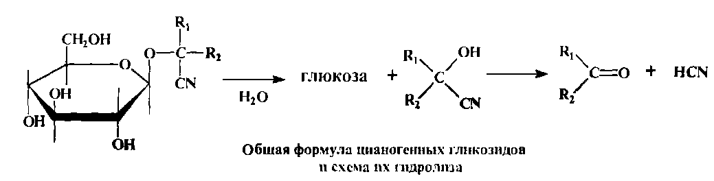 Другая интересная группа растительных О-гликозидов - это цианогенные гликозиды, агликоновый компонент которых образован из а-циангидринов. Их особенностью является способность выделять синильную кислоту при ферментативном гидролизе, которому они подвергаются чрезвычайно легко: появление запаха "горького миндаля" при использовании семян некоторых растений указывает на присутствие в них таких гликозидов и на начало реакции их распада.