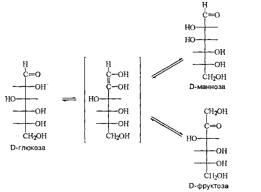 В мягких щелочных условиях обычно имеет место эпимеризация, т.е. изменение конфигурации углеродного атома в 2-положении к карбонильной группе, а также изомеризация типа альдоза р. кетоза. Так, при выдерживании D-глюкозы в течении нескольких дней в 0,01 М растворе гидроокиси натрия образуется смесь, содержащая 28% D-фруктозы, 3% D-маннозы и исходную D-глюкозу. Оба изомеризационных процесса протекают через общий интермедиат, являющийся енольной формой D-глюкозы, т.е. указанная смесь веществ является следствием кетоенольной таутомерии, катализируемой основанием. Заметим, что реакция идет из ациклической формы, являющейся также компонентой таутомерного процесса.