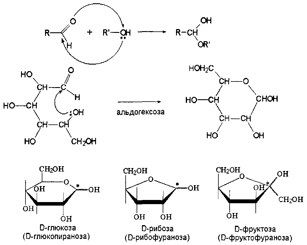 Следствием этих основных факторов является преимущественное образование шестичленного циклического полуацеталя в случае глюкозы, пятичленного циклического полуацеталя в случае рибозы, пятичленного циклического полуацеталя в случае фруктозы. В номенклатуре соединений это отражают введением названия соответствующего кислородного гетероцикла в качестве корневого слова - пираноза и фураноза. Но надо еще раз подчеркнуть, что такое формирование циклических форм является преимущественным: образование фураноз в случае альдогексоз и пираноз в случае альдопентоз также не исключено.