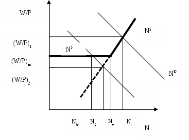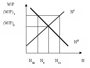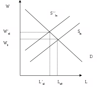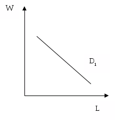 Так как функция спроса на труд – производная функции предложения товаров, то функция спроса на труд — убывающая.