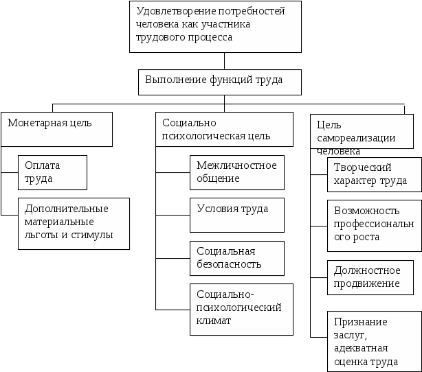 Итак, с точки зрения работника, его потребности могут быть выражены через функции труда, которые он (т.е. труд) выполняет по отношению к человеку как участнику конкретного трудового процесса. Эту систему целей структурно можно представить следующим образом (рис. 2).