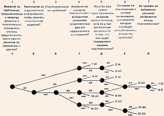 Как и в предыдущих моделях, Врум и Йеттон отмечают, что выделенные ими пять стилей руководства довольно условны и зависят от ситуации. В связи с этим, учитывая 7 критериев оценки ситуации, авторы разработали «дерево решений», которое может использовать руководитель в практике управления (рис. 3) [3]: