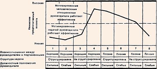 Из восьми ситуаций первая является наиболее благоприятной для руководителя. В ней задача хорошо структурирована, должностные полномочия большие, а отношения между руководителем и подчиненными также хорошие, что создает максимальную возможность для оказания влияния. В противоположность этому, ситуация 8 - наименее благоприятная, потому что должностные полномочия невелики, отношения с подчиненными плохие и задача не структурирована. По результатам исследований Фидлера самым эффективным стилем руководства является ориентация на задачу.