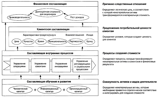 Цели четырех взаимозависимых составляющих представляют собой цепь причинно-следственных связей. Активное использование нематериальных активов в решении стратегических задач способствуют улучшению показателей внутренних бизнес-процессов, что, в свою очередь, обеспечивает успех для клиентов и акционеров.