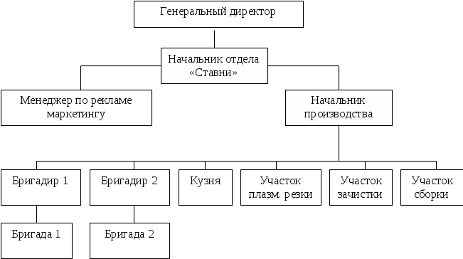 Организационная структура управления предприятия представлена на рисунке 1. Генеральный директор определяет стратегию развития, контролирует работу всего предприятия. Начальник отдела «Ставни» контролирует работу менеджера по рекламе и маркетингу и начальника производства, обобщает информацию и принимает тактические решения.