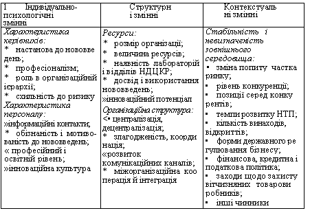 Розрізняють два типи нововведень в організації. Організаційні – нововведення, які є результатом організаційних рішень і не потребують зміни індивідуальної поведінки від більшості членів організації (наприклад, освоєння нової продукції). Змінюється організація як ціле, а не поведінка більшості її робітників. Нововведення в організації, які потребують зміни поведінки індивідів. Це: реорганізація організаційної структури, перебудова структури комунікацій, зміна вимог до персоналу, зміни технологій і організації виробництва, які потребують нової кваліфікації робітників, ціннісних орієнтацій, відмови від стереотипів поведінки. Сприйнятливість організації до нововведень – це властивість суб'єкта опанування, а саме: час освоєння нововведення даною організацією порівняно з іншими. Опанування нововведення складається з двох стадій: ініціювання – процес, за допомогою якого організація дізнається про новацію і вирішує її опанувати; упровадження – це процес, за допомогою якого організація здійснює інновацію і вона стає невід'ємною частиною самої організації. Чим раніше буде прийнято рішення про впровадження інновацій або чим більше буде освоєно нововведень за певний період у порівнянні з іншими суб'єктами опанування нововведень, тим вища сприйнятливість організації. Тобто сприйнятливість організації до нововведень розглядається як похідна кількох груп чинників структурних, індивідуально-психологічних, ринкових, комунікаційних, контекстуальних. Уявлення про склад змінних, які використовуються спеціалістами для оцінювання сприйнятливості організації до нововведень, дає табл. 2.1.