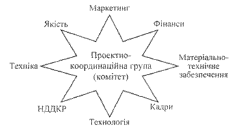 Дуже гнучким варіантом, придатним для фірми будь-якого розміру, є створення «комітету з нових товарів», «венчурної команди» з нового проекту або проектно-координаційної групи (рис. 2.2). Проектно-організаційна група (комітет) працює, як правило, на постійній основі, збираючись, наприклад, один раз на місяць. До комітету входять представники різних функціональних підрозділів: НДДКР, виробництва, маркетингу, фінансів, кадрів. Очолює такий комітет генеральний директор або віце-президент з питань розвитку організації. [6, c. 115] Його завдання – забезпечити діалог між функціональними відділами і керувати процесом розроблення інновації.