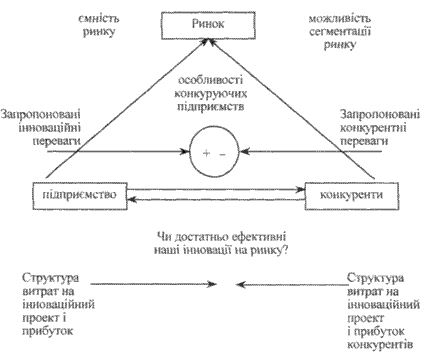 «Венчурна команда» – це група, що створюється з метою розроблення і реалізації інноваційного ризикового проекту. Яка б організаційна модель не використовувалась, її головними завданнями є: вироблення та затвердження оперативних і короткострокових планів для всіх підрозділів; координація роботи різних підрозділів у напрямі, необхідному для ефективнішого здійснення інноваційної діяльності; спрямування інформаційних потоків з метою найоперативнішого виконання поставлених завдань всіма підрозділами; забезпечення детального інформування всього персоналу про діяльність підприємства, про його стратегічні цілі та проблеми; делегування повноважень, високий ступінь залучення персоналу до вироблення рішень, мотивації та стимулювання праці; забезпечення більшої гнучкості виробничих модулів. Створення проектної координаційної групи з працівників підприємства дає змогу заощадити кошти на залучення спеціалістів та експертів зовні, використати знання та досвід управлінського персоналу підприємства, зменшити ризик розрізненого виконання завдань та опір усієї організаційної структури підприємства інноваційним змінам. Крім розглянутих чинників, на рівень сприйнятливості організації до нововведень впливає сам характер нововведення: властивості технології чи продукту, набір вигід, які одержить підприємство як користувач нововведення. Важливими є сумісність нововведення (техніки, технології) з іншим устаткуванням (процесами), складність конструкції, простота в експлуатації, очікуваний прибуток, ступінь ризику й ін. На сприйнятливість до нововведення має вплив концепція нового продукту (послуга), яка розглядається як набір певних властивостей, що принесуть переваги користувачам. Справа в тому, що одна й та сама ідея може привести до різних концепцій. [4, c. 57] Тому, визначаючи концепцію продукту, організація (фірма, підприємство) робить вибір, виходячи із своїх цілей і можливостей. Для керівництва фірми концепція нового продукту вказує на характер ресурсів, які необхідно виділити на реалізацію проекту. Крім того, концепція нововведення визначає базовий ринок, на якому майбутній продукт буде позиціюватись. З цього приводу маркетингова служба повинна дати відповідь: яку нішу на ринку може зайняти новий продукт, як на нього будуть реагувати потенційні споживачі, конкуренти, яка тривалість розроблення та впровадження нововведення. Чинник часу має важливе значення і безпосередньо впливає на рентабельність нового товару. Виникає необхідність постійно відстежувати стан розробки на різних етапах НДДКР і вимірювати рівень її відповідності поставленим цілям і завданням за строками виконання проекту. Отже, сприйнятливість до інновацій потребує від організації здатності до створення нових ринків, нових товарів, техніки і технології, при цьому необхідно брати до уваги, що конкуренти не сидітимуть, склавши руки, а також будуть прагнути до перемоги. Тож важливими є аналіз інформації про конкурентне середовище, оцінка рівня попиту на аналогічні товари та послуги. Аналіз і зіставлення конкурентних переваг та можливостей охоплюють оцінку ємності ринку, можливості його сегментації, вигоду, яку пропонують споживачу конкуренти. На рис. 2.3 показаний загальний аналіз позицій організації на конкурентному ринку. Вигоди для спожив