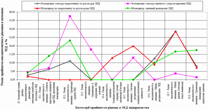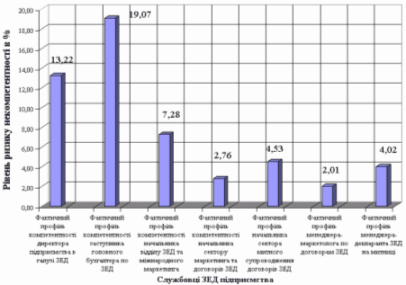Таким чином, на підприємстві ПП „Промен” рівень ризику прийняття некомпетентного рішення в сфері ЗЕД знижується обратнопропорційно займаємій посаді, оскільки знижується обсяг функціональних обов’язків та підвищується рівень їх спеціалізації.