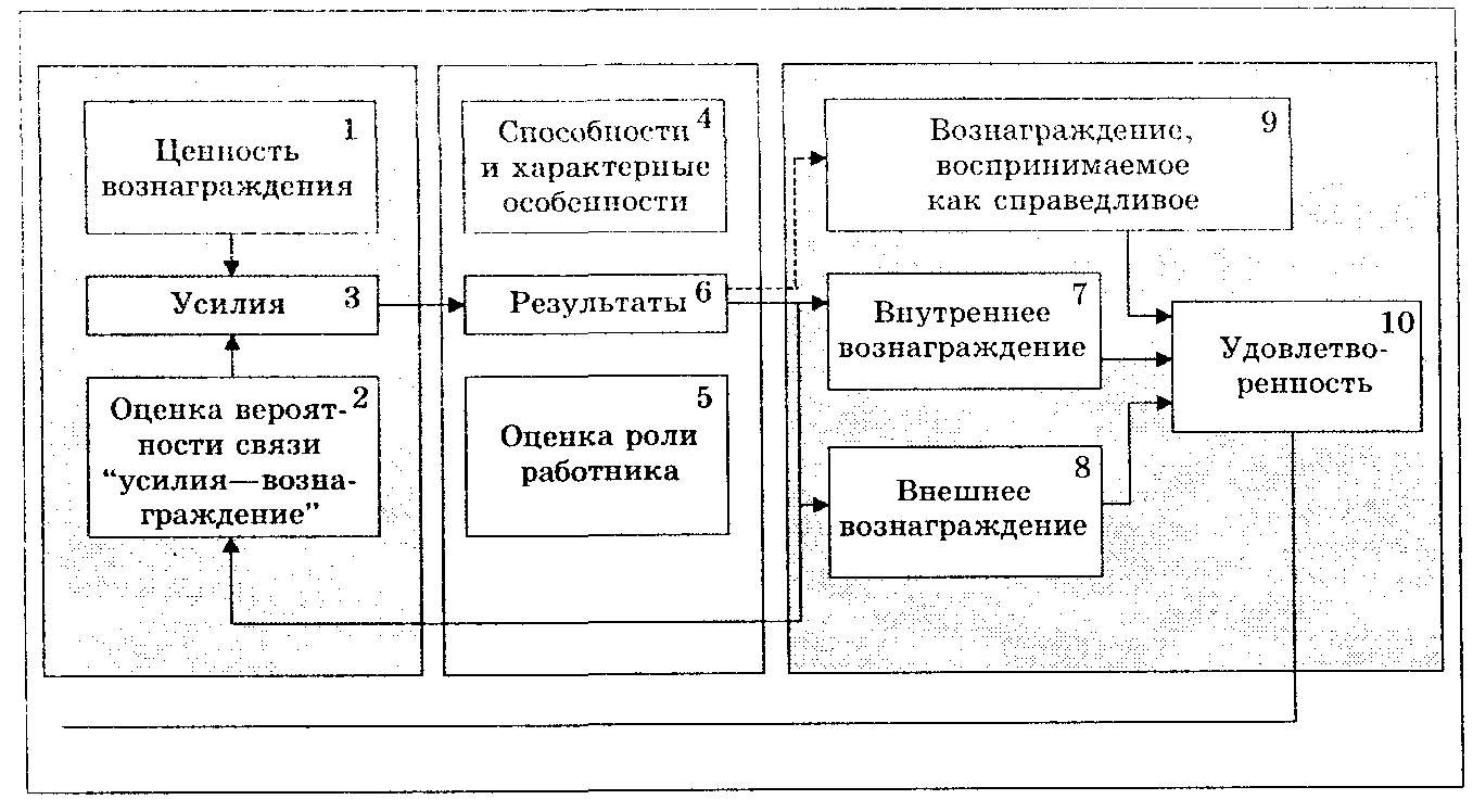 Комплексная модель Портера-Лоулера включает элементы теории ожидания и теории справедливости. В модели заложены мять переменных: затраченные усилия, восприятие, полученные результаты, вознаграждение, степень удовлетворения. Состав и содержание блоков модели приведены в таблице 1.