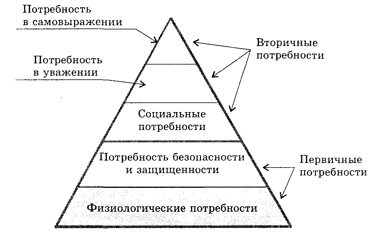 Все эти потребности Маслоу расположил в виде строгой иерархической структуры (пирамиды). При этом потребности первого и второго уровней отнесены к первичным потребностям, а последующие (третий - пятый уровень) - ко вторичным потребностям.