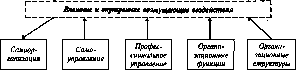 Внутренние и внешние возмущающие воздействия приводят к нарушению принятого порядка деятельности в организации (к нарушению гармонии). Вследствие этого возникают процессы, помимо воли и сознания людей стремящиеся сформировать новые пропорции, ввести новые элементы в деятельность организации или вывести из нее устаревшие. Люди являются проводниками (осознанными или неосознанными) этих процессов. Кроме того, возмущающие процессы могут инициироваться и самоуправлением, профессиональным управлением, реализацией функций и структур управления (рис. 2.2.). Таким образом, может быть достаточно много циклов возникновения самоорганизации и вследствие этого самоуправления.
