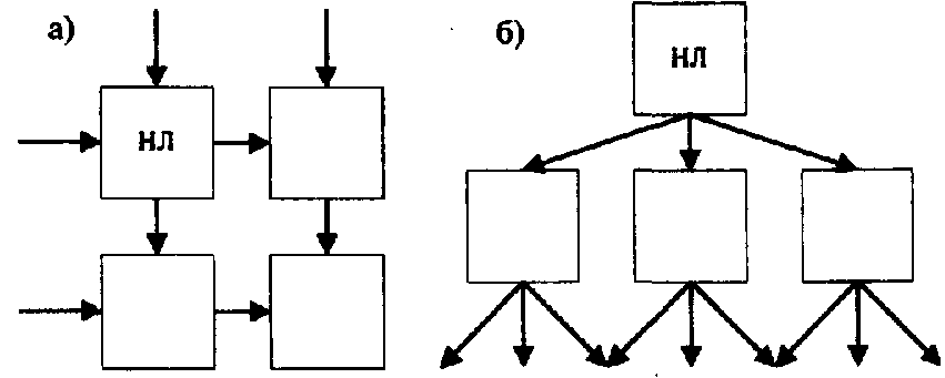 Схемы коллективной самоорганизации определяются типом среды коммуникаций. Для внутренней среды характерны типовые схемы отношений в виде линии, кольца, колеса, звезды и т.д., в которых узловым элементом является не руководитель, а неформальный лидер (НЛ) (рис. 2.3.).