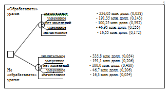 Вероятности каждого из этих исходов проставлены в скобках возле стоимости ущерба. Если же правительственное ведомство выбирает нижнюю ветку дерева решений, соответствующую решению не "засевать" ураган, то далее возможны те же пять исходов. Имущественный ущерб, соответствующий каждому из этих исходов, а также их вероятности проставлены на правом конце из веток.