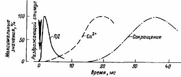 Молекулярный механизм сокращения мышечного волокна состоит в том, что возникающий в области концевой пластинки потенциал действия распространяется по системе поперечных трубочек вглубь волокна, вызывает деполяризацию мембран цистерн саркоплазматического ретикулума и освобождение из них ионов кальция. Свободные ионы кальция в межфибриллярном пространстве запускают процесс сокращения. Совокупность процессов, обуславливающих распространение потенциала действия вглубь мышечного волокна, выход ионов кальция их саркоплазматического ретикулума, взаимодействие сократительных белков и укорочение мышечного волокна называют "электромеханическим сопряжением". Временная последовательность между возникновением потенциала действия мышечного волокна, поступлением ионов кальция к миофибриллам и развитием сокращения волокна показана на рисунке.