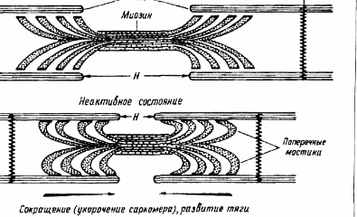 При возбуждении волокна Са+2 выходит из цистерн саркоплазматического ретикулума и, следовательно, концентрация его вблизи миофибрилл возрастает. Под влиянием активирующих ионов Са молекула тропонина изменяет свою форму таким образом, что выталкивает тропомиозин в желобок между двумя нитями актина, освобождая тем самым участки для прикрепления миозиновых поперечных мостиков к актину. В результате поперечные мостики прикрепляются к актиновым нитям. Поскольку головки миозина совершают "гребковые" движения в сторону центра саркомера происходит "втягивание" актиновых миофиламентов в промежутки между толстыми миозиновыми нитями и укорочение мышцы.