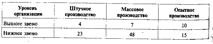Таблица 2. Масштаб управляемости для различных звеньев организационной иерархии и типов производств