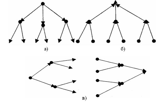 5. веерная. Разомкнутая централизованная конфигурация. Сформирована на основе конвергентных и дивергентных соединений. В зависимости от пространственной ориентации может быть вертикальной или горизонтальной, а в зависимости от типа базового соединения - расходящейся или сходящейся. Примером вертикального расходящегося веера является традиционная система линейного управления (рис.5а), сходящегося - система обратной связи и информационного обеспечения руководства (рис.5б). Примером горизонтального расходящегося (сходящегося) веера является технологическая структура производства с расширением (сокращением) по ходу технологического процесса числа производственных участков (рис.5в).