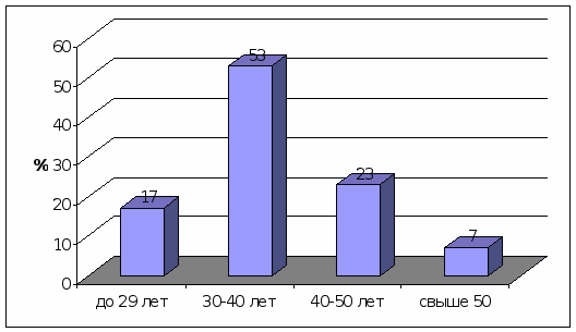 Основной состав сотрудников имеет возраст от 30 до 40 лет – 19 человек или 53%, число сотрудников в возрасте до 29 лет составляет 6 человек или 17% и в возрасте от 40 – 50 лет - 8 человек или 23%. Работники свыше 50 лет составляли 2 человека или 7% .