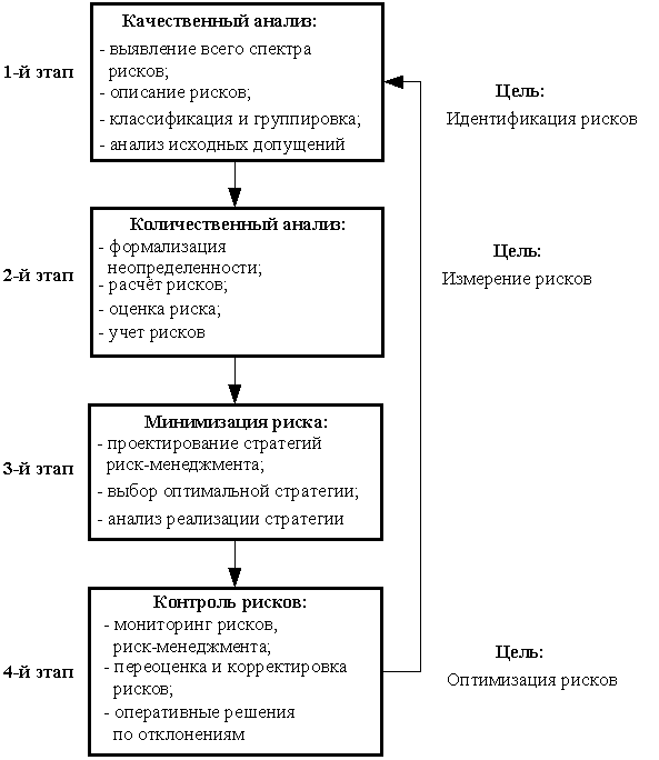 Итак, значение любого риска для каждого участника индивидуально, а общий риск инновационного проекта есть сложная система частных (в том числе, индивидуальных) рисков со сложными многочисленными связями. Система риск-менеджмента инновационного проекта должна содержать стадии в соответствии с рисунком 3 [6].