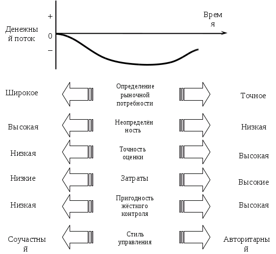 Отличаясь значительно большей неопределенностью, инновационные научно-технические проекты имеют то преимущество, что они могут быть прекращены при небольших финансовых потерях уже на ранних стадиях разработки;
