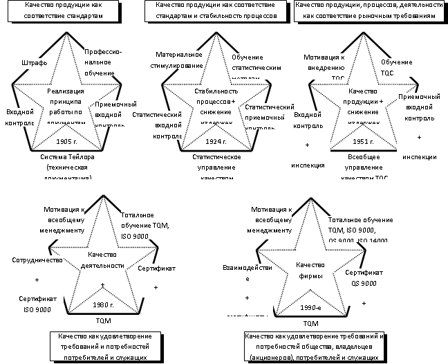 Для графической иллюстрации основных этапов развития систем качества используют фигуру, хорошо известную в российском производстве – "Знак качества". Контур этой фигуры, который, как известно, называется "Пентагон", заполним пятиконечной звездой и то, что получилось, назовем “Звездой качества" (рис. 1.1).