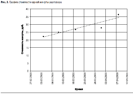 Для того чтобы выяснить реальную ситуацию, в рамках проводимого авторами эксперимента был начат контроль разговоров одного из них с сохранением документов на оплату. Для удобства расчетов каждый раз оплачивалась одна и та же сумма в 200 руб., а также фиксировалась продолжительность всех разговоров. По результатам эксперимента был составлен график стоимости (рис.3), на котором наглядно видно, что реальная цена минуты существенно отличается от заявленной в тарифном плане, и, более того, можно увидеть постоянный ее рост.
