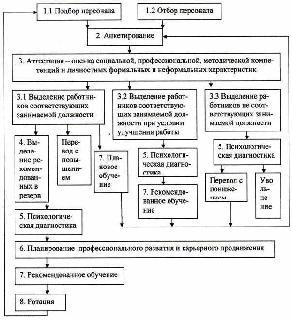 Совокупность взаимосвязанных подразделений системы управления персоналом и должностных лиц. Подразделения - носители функций управления персоналом - могут рассматриваться в широком смысле как служба управления персоналом. Конкретное место и роль указанной службы в общей системе управления организацией определяются местом и ролью каждого специализированного подразделения по управлению персоналом и организационным статусом его непосредственного руководителя. Важным этапом в процессе построения оргструктуры является формирование связей между ее звеньями. При этом должны четко фиксироваться вид связи, ее содержание, периодичность, материальные носители. Можно выделить четыре вида структурной связи: линейная (непосредственное адм. подчинение); функциональная (методическое обеспечение, консультирование смежного подразделения); соисполнительства (совместное выполнение работ); обеспечивающая (подготовка информации или иная работа смежного подразделения по обеспечению процесса принятия решения).