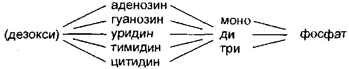 Название нуклеотидов состоит из трех частей: название нуклеозида, входящего в данный нуклеотид; числительное, показывающее количество остатков фосфорной кислоты, и слово «фосфат»: