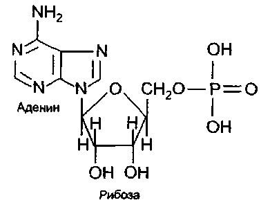 Например, нуклеотид, состоящий из аденина, рибозы и фосфорной кислоты, называется аденозинмонофосфат, или сокращенно АМФ, и имеет следующее строение: