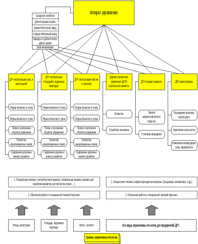 Эксплуатационные подразделения в зависимости от объема работ целесообразно создавать в каждом районе города. При отсутствии городских районов (если город невелик и не разделён естественными преградами) может создаваться единственное эксплуатационное звено. Основные подразделения предприятий дорожного хозяйства могут специализироваться не только на основе выполнения отдельных видов ремонтных работ, но и по ремонту отдельных или групп объектов. В зависимости от их количества, рассредоточенности по территории города могут создаваться специализированные подразделения по ремонту или эксплуатации городских улиц, транспортных магистралей, мостов, подземных переходов, туннелей и других сооружений. При незначительном количестве разнообразных объектов следует создавать комбинированные подразделения по ремонту мостов и подземных сооружений, ремонту улиц и транспортных магистралей и т.д. Характер комбинаций зависит не только от количества объектов и объёмов необходимых работ, но и от их территориальной близости. Если в одном из городских районов сосредоточены мосты, развязки дорог на разных уровнях, эстакады, то ремонт или эксплуатацию целесообразно передать одному подразделению. Работы по текущему и капитальному ремонту, а также и реконструкции можно выполнять силами одного объединённого подразделения либо создавать отдельные ДРУ по каждому из этих направлений. Также кроме прилагаемой ниже схемы возможны варианты с образованием в составе производственной структуры основных подразделений, занятых работой по укладке асфальта; действующих в зимний период и т.д. Выбор определённой оптимальной структуры управления зависит от специфики города в целом и особенностей конкретных объектов управления в частности. Например, если на большинстве участков преобладают земляные работы, то на основе их выделения следует создать специализированное подразделение по земляным работам.