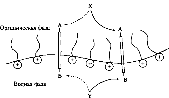Рис. 9. Ориентация реагентов на межфазной границе микроэмульсии может индуцировать региоселективность. Водорастворимый реагент Y атакует молекулы соединения с двумя реакционноспо-собными группами со стороны водной фазы, в то время как маслорастворимый реагент X атакует реакционноспособные группы со стороны масляной фазы