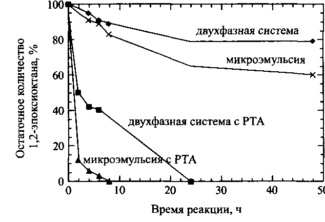 Рис. 7. Скорость реакции раскрытия цикла липофильного эпоксида под действием гидросульфита. Реакция проведена в двухфазной системе и в микроэмульсиях без добавок и в присутствии межфазного переносчика