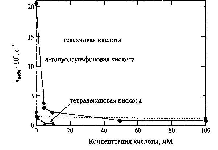 Каталитические мицеллярные эффекты также исчезают в присутствии противоположно заряженных гидрофобных поверхностно-активных веществ. Как видно из рис. 5, кислоты с гидрофобными радикалами средней длины ингибируют гидролиз, скорость которого становится равной скорости гидролиза пропилбетаината. Тетрадекановая кислота почти полностью останавливает гидролиз при концентрации ниже 5 мМ. Этот эффект объясняется образованием смешанных мицелл тетрадецилбетаината и тетрадеканоата. Выше некоторой концентрации тетрадеканоата заряд мицелл становится отрицательным, что приводит к отталкиванию между гидроксид-ионами и мицеллярной поверхностью.