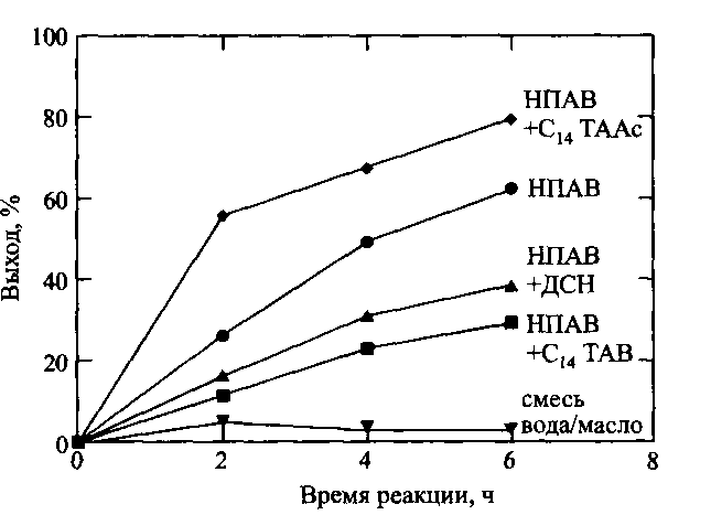 Влияние выбора ПАВ на выход реакции покажем на примере реакции между децил бромид ом и сульфитом натрия, в результате которой образуется поверхностно-активное вещество децилсульфонат: