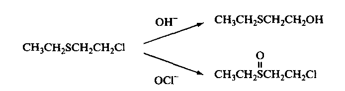 Рис. 6. Превращение 2-хлорэтилсульфида: в 2-гидроксиэтил-сульфид в щелочной среде и в 2-хлорэтилсульфоксид под действием гипохлорита натрия