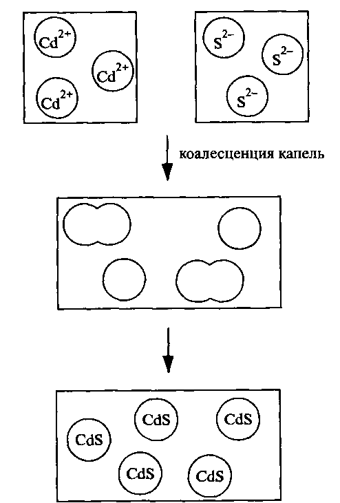 Как уже упоминалось, главная особенность этого процесса состоит в контакте между двумя водорастворимыми солями, который происходит при кратковременном слиянии капелек. Это очень быстрый процесс с константой скорости реакции второго порядка, равной IO6-IO7 л/мольс, причем ее значение в какой-то степени зависит от размера капелек. В результате ряда последовательных процессов образуются стабильные микрочастицы CdS.