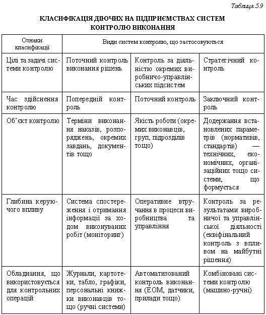Контроль і перевірка виконання робіт за стратегічними планами та програмами передбачає розробку взаємопов’язаних систем контролю на підприємствах, які включають в себе такі підсистеми контролю: за технологічними процесами; якістю продукції та праці; дотриманням діючого законодавства, що регулює діяльність підприємства; виконанням окремих завдань, етапів, напрямків та стратегічних програм і планів загалом; виконанням рішень, вказівок, наказів, розпоряджень вищого керівництва підприємства; дотриманням встановлених фінансово-економічних параметрів функціонування підприємства тощо. На вітчизняних підприємствах нагромаджено позитивний досвід використання різних систем контролю, який відрізняється цілями, завданнями, об’єктами, методами та формами. У табл. 5.9 наведено одну з класифікацій систем контролю, що застосовується на промислових підприємствах.