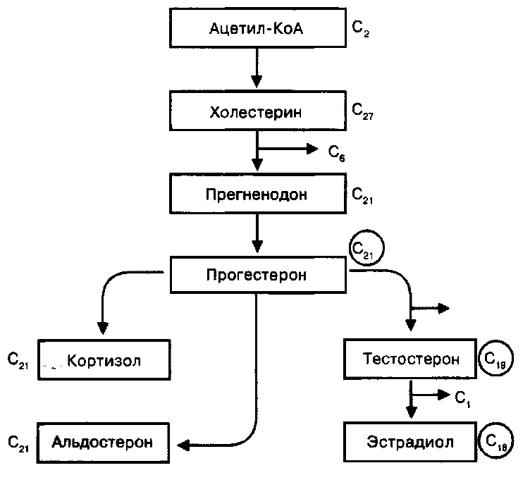 Стероиды липофильны, это означает их низкую способность растворяться в воде. Поэтому в крови 95% стероидных гормонов находятся в связанном состоянии со специфическими транспортными белками. Равновесие между связанными и свободными стероидами подчиняется закону действующих масс. С помощью транспортных белков гормоны переносятся к своим органам-мишеням. Только свободные, не связанные с белком стероиды являются биологически активными. Секс-стероидсвязывающий глобулин (СССГ) специфично связывает эстрадиол и андро-гены с низкой емкостью и высокой афинностью, в то время как кортико-стероидосвязьшаюший глобулин (КСГ) связывает прогестерон и глюко-кортикоиды. Помимо своей транспортной функции специфические сывороточные гормон-связывающие белки защищают стероиды от метаболической инактивации по пути от секретирующей их железы к органу-мишени. СССГ и КСГ являются кислыми гликопротеидами с молекулярной массой 45000 (СССГ) и 65000 (КСГ). Синтез стероидных гормонов полностью происходит в организме человека (см. рис.3). Начальная субстанция - КоА, активирует уксусную кислоту - углеродное соединение, из которого в результате ряда превращений, дальнейшей конденсации и циклизации формируется холестерин. Холестерин состоит из 27 углеродных атомов и помимо прочих составляющих является главным компонентом начальной стадии синтеза стероидных гормонов.