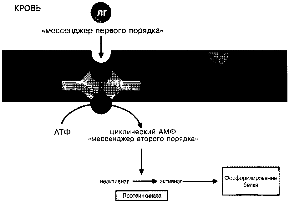 ФСГ и ЛГ осуществляют свою гормональную активность посредством рецепторов на поверхности гонадальной клетки-мишени; в данном процессе соответствующий гормон выступает в роли мессенджера первого порядка. Затем, в процессе каскада последовательных реакций, гормональный импульс распространяется в клетке-мишени с помощью циклического АМФ - мессенджера второго порядка (см. рис.1). Во взаимодействии с эстрадиолом ФСГ индуцирует его рецепторы; рецепторы ЛГ также индуцируются ФСГ.