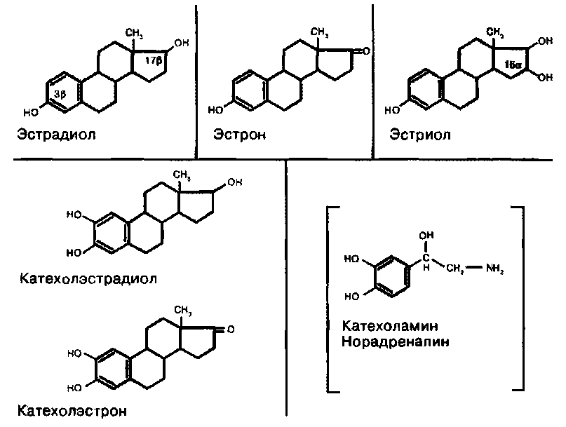 Другой интересной группой эстрогенов являются катехолэстрогены, т.е. стероиды, производные эстрадиола и эстрона и имеющие дополнительную группу во втором положении кольца А. Это делает их сходными с катехоламинами: адреналином и норадреналином. Катехолэстрогены, помимо прочих мест, синтезируются в гипоталамусе, где они, по мнению многих исследователей, выполняют роль нейротрансмиттеров, как и катехоламины.