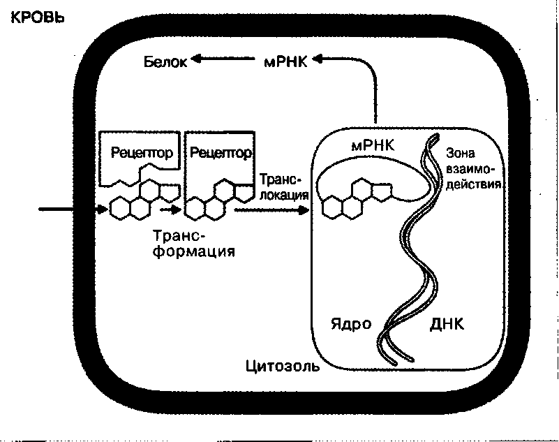 Образовавшийся цитоплазматический комплекс стероид-рецептор постепенно активируется или трансформируется и перемещается внутрь клеточного ядра - места локализации генетического аппарата. Здесь комплекс гормон-рецептор входит во взаимодействие со специфическим молекулярным отрезком на хроматине, так называемой зоной ядерного взаимодействия, которая соответствует молекулярной области на комплексе стероид-рецептор.