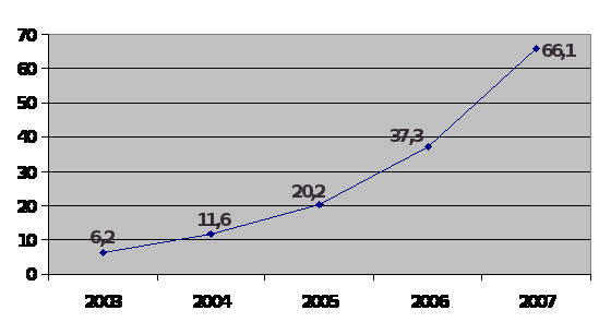 Диаграмма роста прибыли с 2003 по 2007 г. (млн. дол)