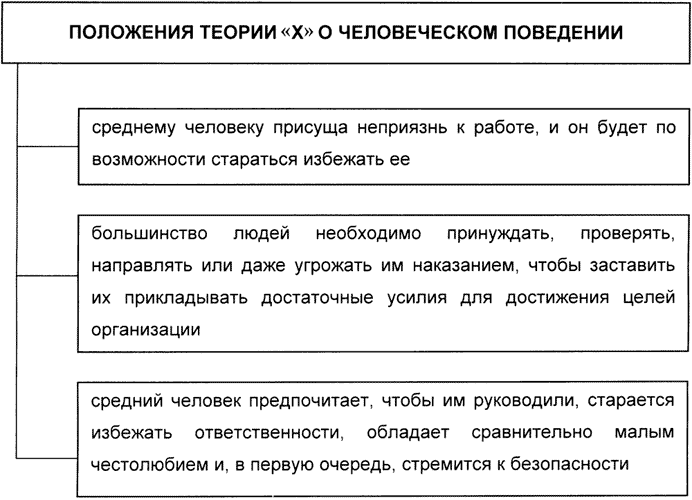 Все эти факторы зависят от руководителя, в той или иной мере влияют на работающего и определяют качество и интенсивность его труда. Д. Мак-Грегор сформулировал, что на основе этих факторов возможно применить два различных подхода к управлению, которые он назвал теорией «X» и теорией «Y» (рис. 2 и рис. 3).