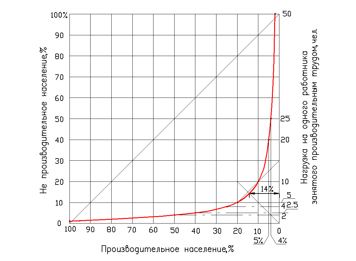Рис.2. График нагрузки на одного работника в зависимости от доли населения занятого производительным трудом.